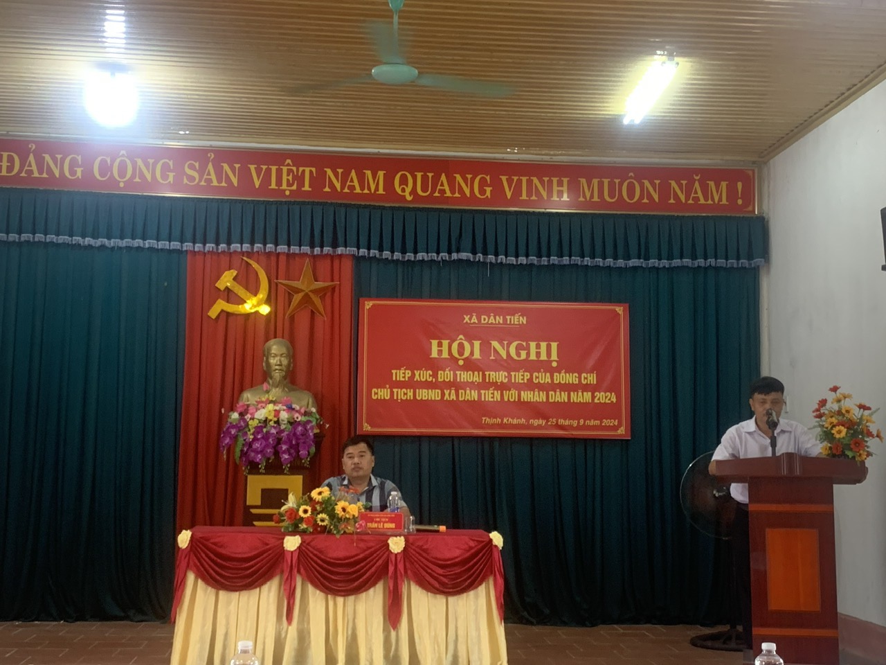 Sáng 25/9/2024, tại nhà văn hoá xóm Thịnh Khánh, xã Dân Tiến. Đảng uỷ, Hội đồng nhân dân, Uỷ ban nhân dân xã đã tổ chức Hội nghị tiếp xúc, đối thoại của đồng chí Phó bí thư, Chủ tịch UBND xã với nhân dân 2 xóm Thịnh khánh và Phương Bá. Dự buổi tiếp xúc có các đồng chí lãnh đạo Đảng uỷ, HĐND, UBND, Uỷ ban MTTQ, trưởng các đoàn thể xã, các bộ phận chuyên môn thuộc UBND xã